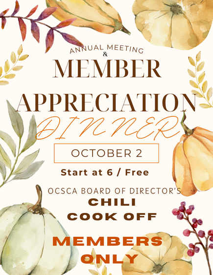 The member appreciation dinner is this Thursday. We need your help settling the debate "beans" or "no beans" in your chili. Yep, the board couldn't agree, so we decided to leave it up to you. Best of all it is free but is for members only. We will also be voting in next year's board members and officers as well as giving you an update on the center. Hope to see you there.